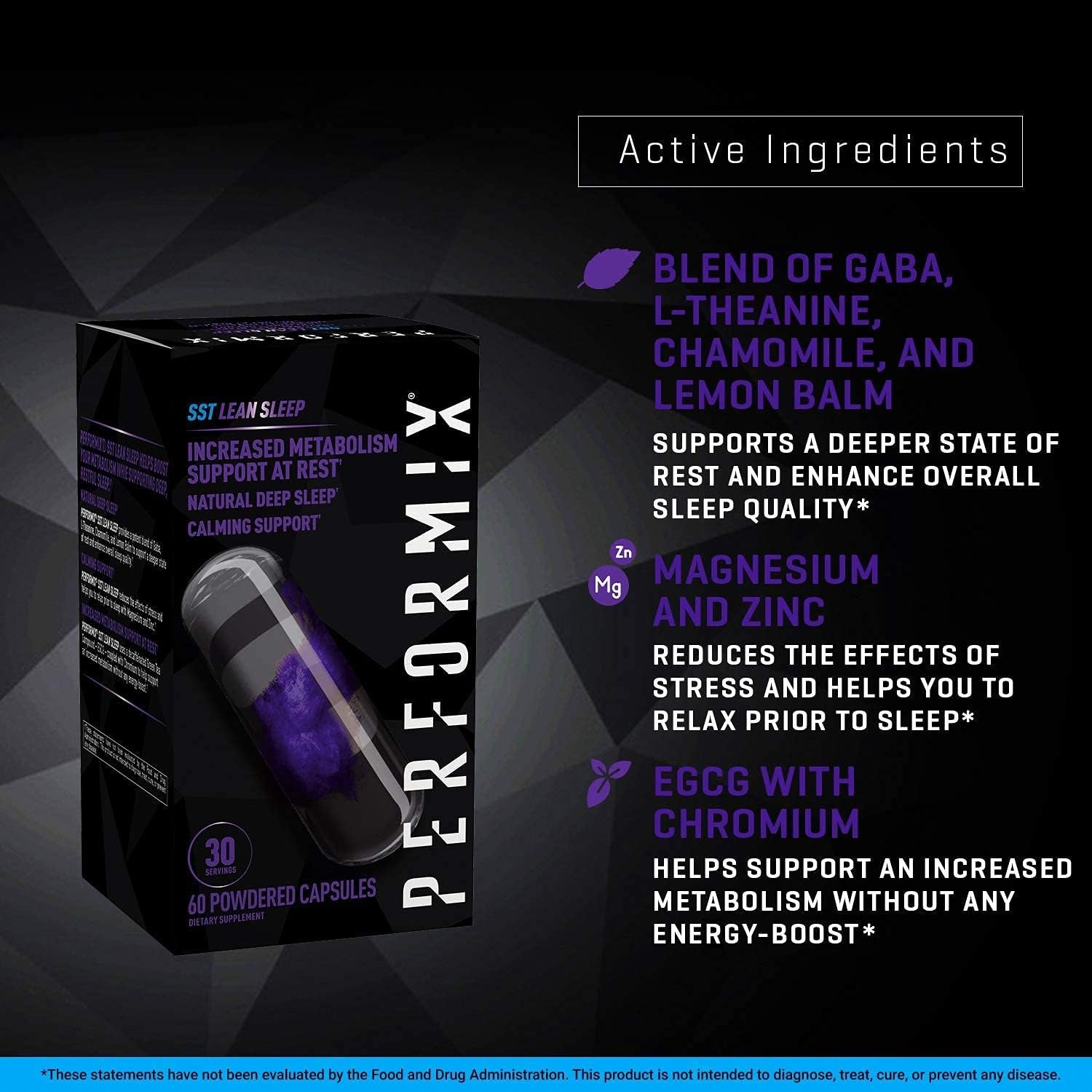 - SST Lean Sleep: Powered by a potent blend of 450 mg of Gaba, 250 mg of L-Theanine per serving and packed with beneficial nutrients from Chamomile, Lemon Balm, Zinc, and Magnesium to support a calming, deeper state of rest. Performix SST Lean Sleep is formulated with a decaffeinated green tea compound (EGCG) coupled with Chromium to help support an increased metabolism without any Energy-boost and help you lose stubborn body fat without any harsh stimulants or artificial ingredients.