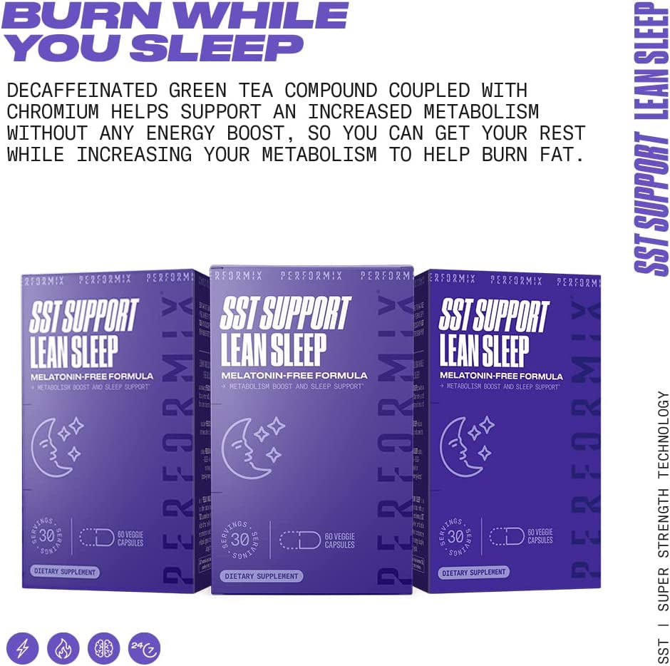 - SST Support Lean Sleep: Increase metabolism, support, better rest, and sleep the night away with Performix SST Support Lean Sleep, the perfect addition to your regular SST regimen. Powered by a potent blend of 450mg Gaba, 250mg L-Theanine per serving, and packed with beneficial nutrients from Chamomile, Lemon Balm, Zinc, and Magnesium to support a calming, deeper state of rest. 60 capsules per pack.