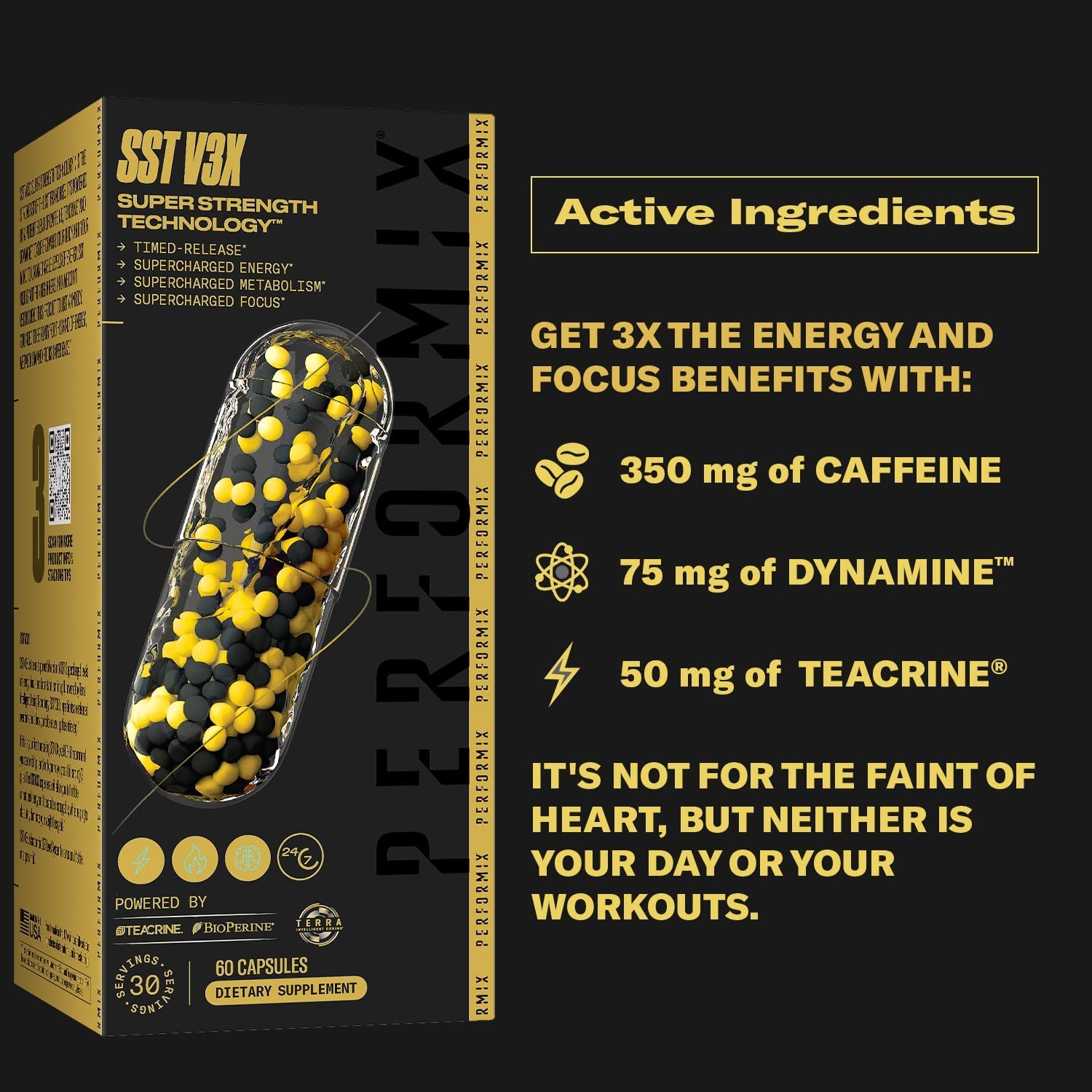 - PERFORMIX SST V3X - 120 Capsules - Dietary Supplement for Supercharged Energy, Intense Mental Focus and Fast Metabolism - Caffeine, Dynamine, and Teacrine - 3X Longer Lasting