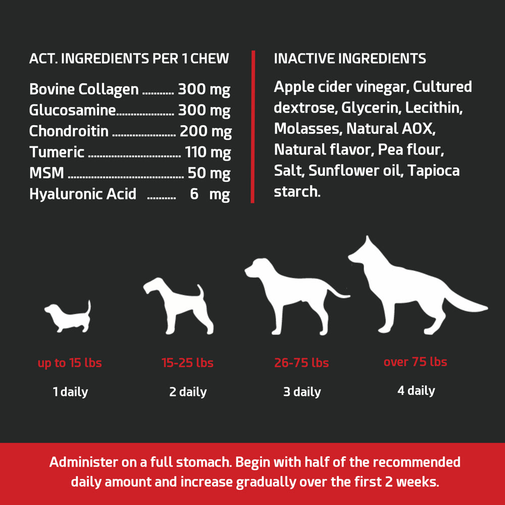 - VET FORMULATED & DOG APPROVED: 1 chew has 300mg of Bovine Collagen, 300mg of Glucosamine, 200mg of Chondroitin, 110mg of Turmeric, 50mg of MSM, and 6mg of Hyaluronic Acid, providing a comprehensive blend of nutrients to support your dog's joint health.