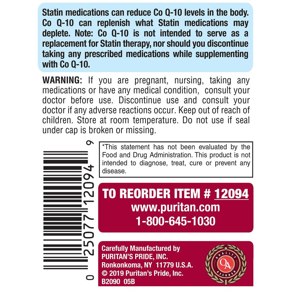 Coenzyme Q10 (CoQ10) is a key antioxidant that has a big job: supporting you as you age gracefully. Coenzyme Q10 (CoQ10) provides powerful antioxidant support. The body produces CoQ10 naturally to assist with the growth and maintenance of cells. Good oral health is linked to cardiovascular health, and Coenzyme Q10 supports both! Puritans Pride CoQ10 is made with a natural, highly bioavailable form of Coenzyme Q10: Q-SORB. This supplement is important for Statin medication users. Taking Q-SORB CoQ10 can help replenish depletions of the antioxidant which are caused by the medications. Our capsules are hermetically sealed in easy to swallow, rapid-release softgels for superior absorption.++Note: Statin medications can reduce CoQ10 levels in the body. CoQ10 can replenish what statin medications can deplete. CoQ10 is not intended to serve as a replacement for statin therapy, nor should you discontinue taking any prescribed medications while supplementing with Co Q-10. Adults may take 1 softgel up to 2 times daily, preferably with meals. Our Coenzyme Q10 supplement is free of artificial flavors and sweeteners. It contains no preservatives, sugar, starch, milk, lactose, gluten, wheat, yeast, or fish. These statements have not been evaluated by the Food and Drug Administration. These products are not intended to diagnose, treat, cure or prevent any disease.