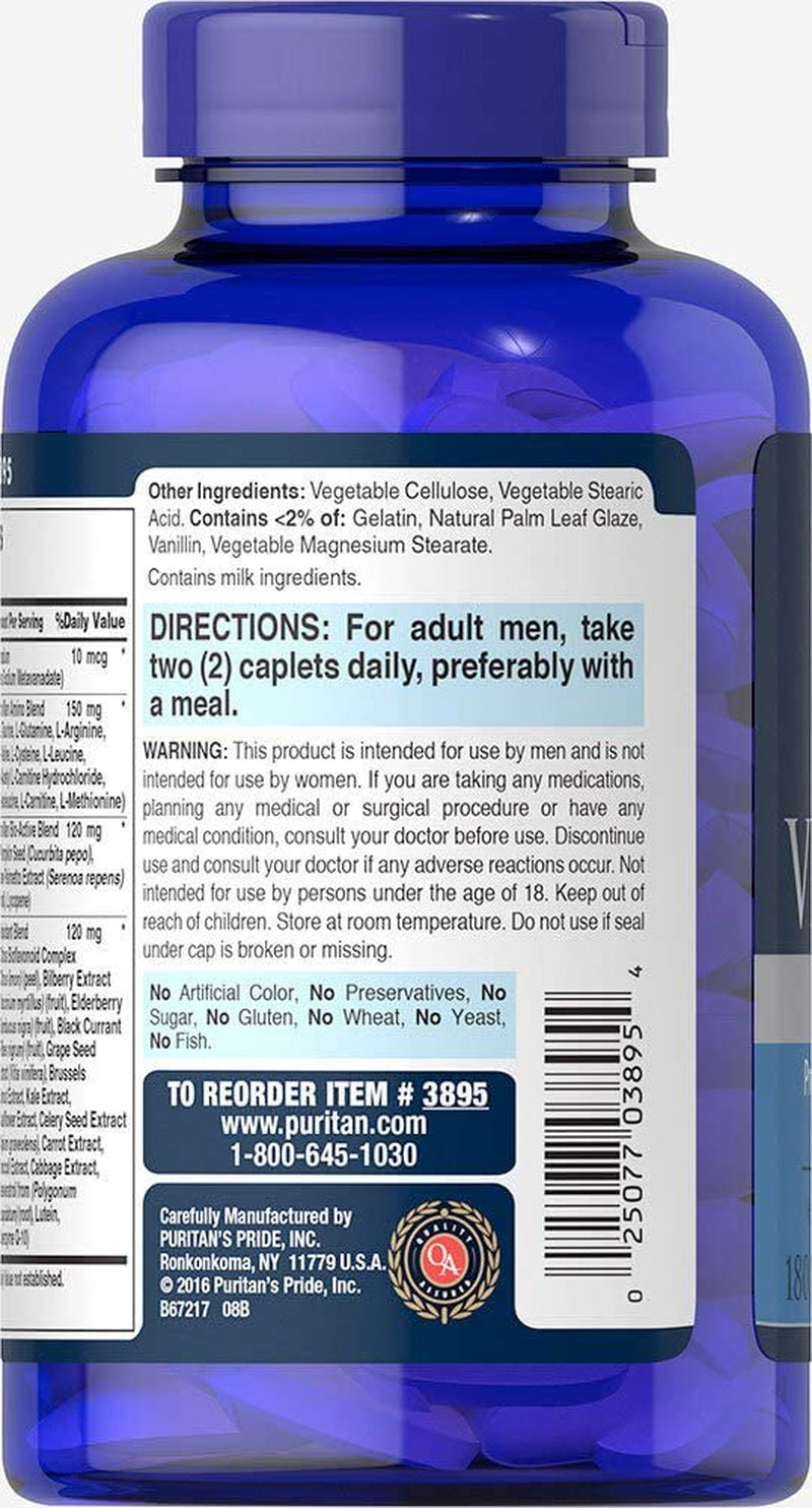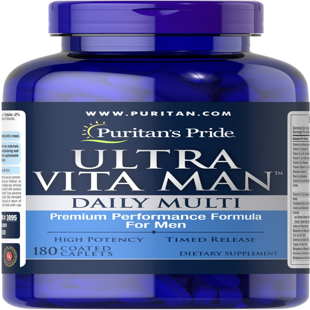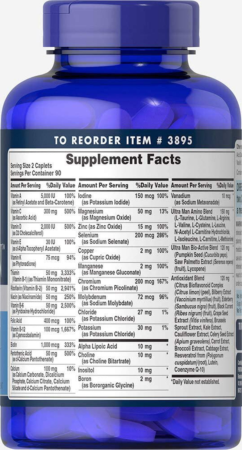 Product Description The high potency multivitamin/ multimineral formula designed specifically for a man's nutritional needs. Offers Antioxidant and Immune Support. Supports Cardiovascular Health. Key features Highest quality vitamins and supplements since 1973 Scientifically formulated Offers Antioxidant and Immune Support Supports Cardiovascular Health Directions/uses For adult men, take two (2) caplets daily, preferably with a meal. Ingredients " Vitamin A (as Retinyl Acetate and Beta-Carotene) 1,500 mcg 167% Vitamin C (as Ascorbic Acid) 300 mg 333% Vitamin D (as D3, Cholecalciferol) 50 mcg (2,000 IU) 250% Vitamin E (as d-Alpha Tocopheryl Acetate) 20 mg 133% Vitamin K (as Phytonadione) 75 mcg 63% Thiamin (Vitamin B-1) (as Thiamin Mononitrate) 50 mg 4,167% Riboflavin (Vitamin B-2) 50 mg 3,846% Niacin (as Niacinamide) 50 mg 313% Vitamin B-6 (as Pyridoxine Hydrochloride) 50 mg 2,941% Folate 666 mcg DFE 167% (400 mcg folic acid) Vitamin B-12 (as Cyanocobalamin) 100 mcg 4,167% Biotin 1,000 mcg 3,333% Pantothenic Acid (as d-Calcium Pantothenate) 50 mg 1,000% Choline (as Choline Bitartrate) 10 mg 2% Calcium 100 mg 8% (as Calcium Carbonate, Dicalcium Phosphate, Calcium Citrate, Calcium Silicate and d-Calcium Pantothenate) Iodine (as Potassium Iodide) 150 mcg 100% Magnesium (as Magnesium Oxide) 50 mg 12% Zinc (as Zinc Oxide) 15 mg 136% Selenium (as Sodium Selenate) 200 mcg 364% Copper (as Cupric Oxide) 2 mg 222% Manganese (as Manganese Gluconate) 2 mg 87% Chromium (as Chromium Picolinate) 200 mcg 571% Molybdenum (as Sodium Molybdate) 72 mcg 160% Chloride (as Potassium Chloride) 27 mg 1% Potassium (as Potassium Chloride) 10 mg Alpha Lipoic Acid 10 mg * Inositol 10 mg * Boron (as Boric Acid) 2 mg * Vanadium (as Sodium Metavanadate) 10 mcg * Ultra Man Amino Blend 150 mg * (L-Taurine, L-Glutamine, L-Arginine, L-Valine, L-Cysteine, L-Leucine, N-Acetyl L-Carnitine Hydrochloride, L-Isoleucine, L-Carnitine, L-Methionine) Ultra Man Bio-Active Blend 120 mg * (Pumpkin Seed (Cucurbita pepo), Saw Palmetto Extract (Serenoa repens) (fruit), Lycopene) Antioxidant Blend 120 mg * (Citrus Bioflavonoid Complex (Citrus limon) (peel), Bilberry Extract (Vaccinium myrtillus) (fruit), Elderberry (Sambucus nigra) (fruit), Black Currant (Ribes nigrum) (fruit), Grape Seed Extract (Vitis vinifera), Brussels Sprout Extract, Kale Extract, Cauliflower Extract, Celery Seed Extract (Apium graveolens), Carrot Extract, Broccoli Extract, Cabbage Extract, Resveratrol from (Polygonum cuspidatum) (root), Lutein, Coenzyme Q-10)"